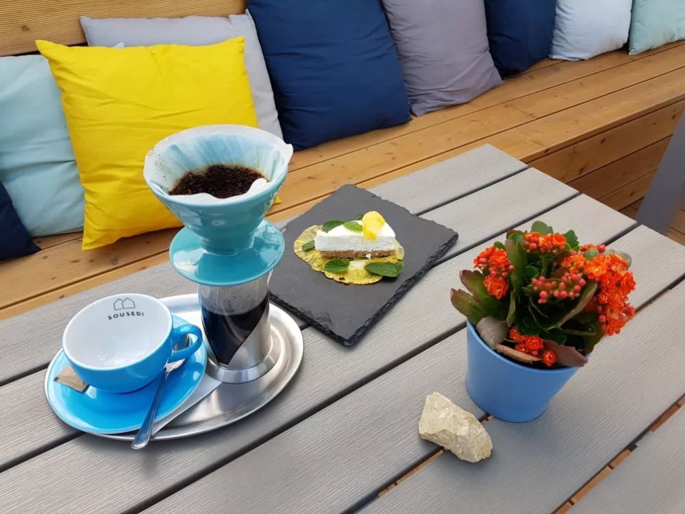 Jižní Morava = totální placka, řeknete si. Postihne-li vás ale nepřekonatelná chuť na kávu a cosi dobrého k tomu, budete muset shodit na malý převodník. Ale nebojte, jen kousek, protože to dobré leží ještě pod největším krpálem na Pálavu. Ta má svůj horizont pořád ještě dost daleko. Vlastně stačí jen natáhnout ruku a budete si ji chladit ve vodě toho moře dole, ve vlnkách Nových Mlýnů. No dobře, tak blízko to zase není, ale tep se ještě nestihne dostat do takových výšin, abyste z menu kavárny Sousedi v Pavlově nezvládli vybírat.