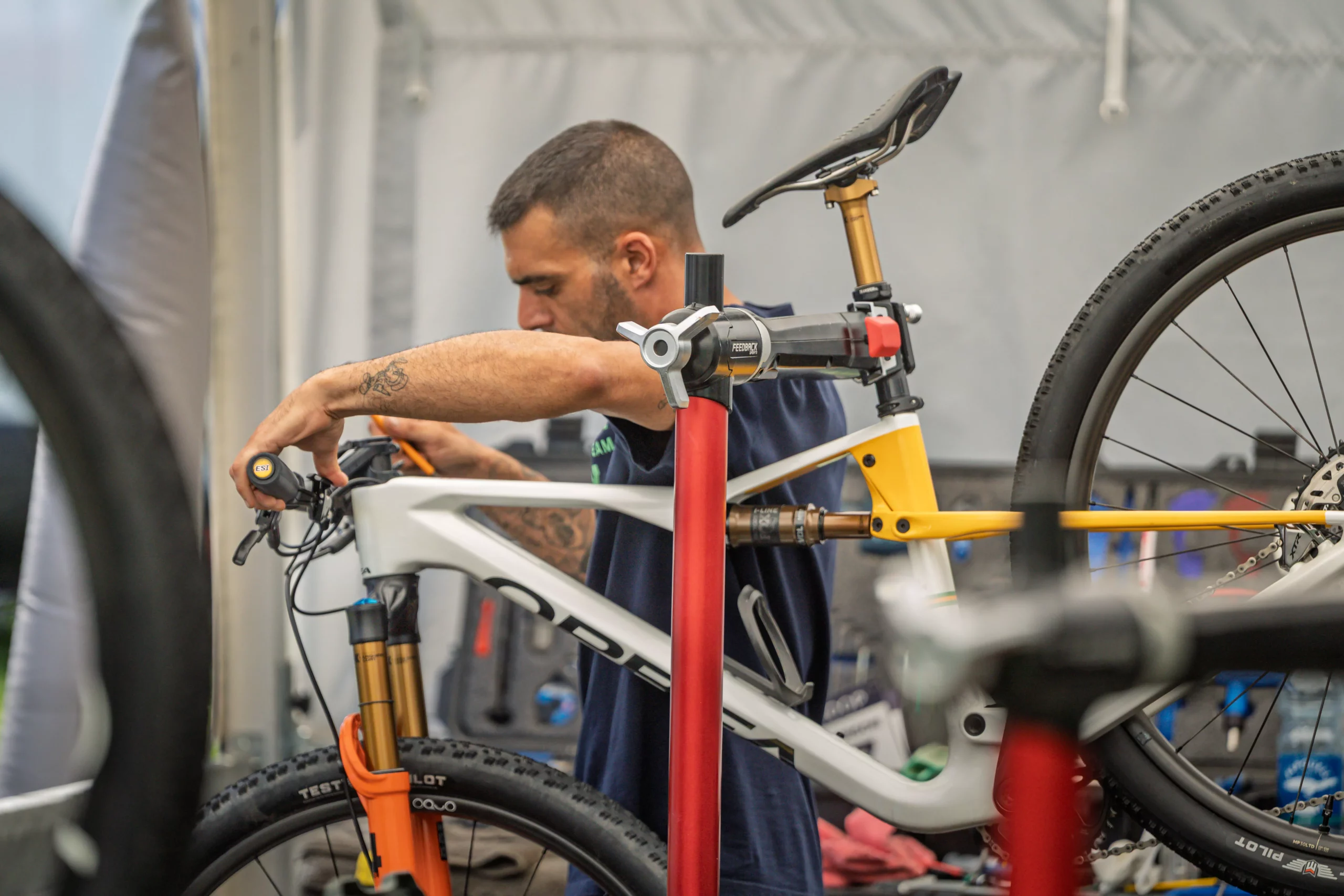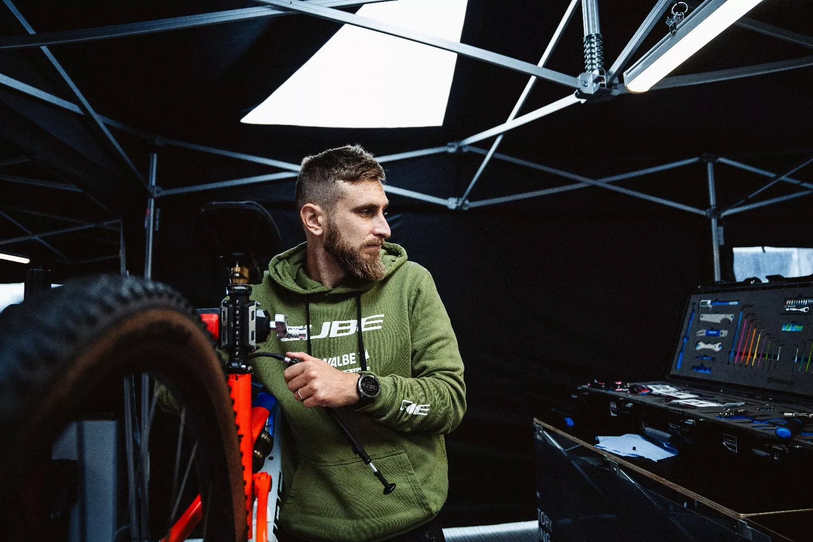 Alejandro Rodriguez z týmu Orbea Fox Factory pečující o bike Australanky Rebeccy Hendersonové tvrdí, že je klíčové brzy vstát a jít se osobně podívat, v jaké stavu je závodní trať. „Jdeme se projít, uděláme fotky a videa, abychom je ukázali jezdcům, a podíváme se, jak dopadl závod do 23 let, který bývá dříve. Na základě toho se pak rozhoduje o nastavení kola,” vysvětluje Alejandro Rodriguez z Alicante s víc jak deseti lety zkušeností v oboru.