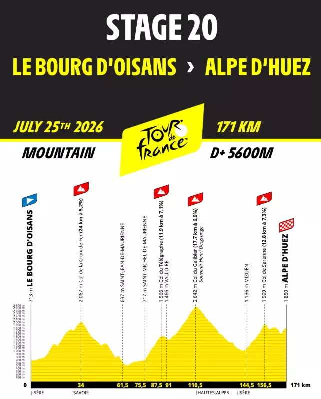 Po volnu přijde na řadu časovka na 26 kilometrů a poté představení sprinterů. A velkolepé finále s třemi horskými etapami a vrcholovými dojezdy. Na zahřátí etapa s dojezdem v lyžařském středisku Orcières-Merlette. A pak dvakrát do Alpe d’Huez. Jednadvacet serpentin jako finále devatenácté etapy by bylo dostatečně dramatickým vyvrcholením. Ale organizátoři šli ještě dál. Bestiální dvacátá etapa bude zahrnovat 5600 výškových metrů.