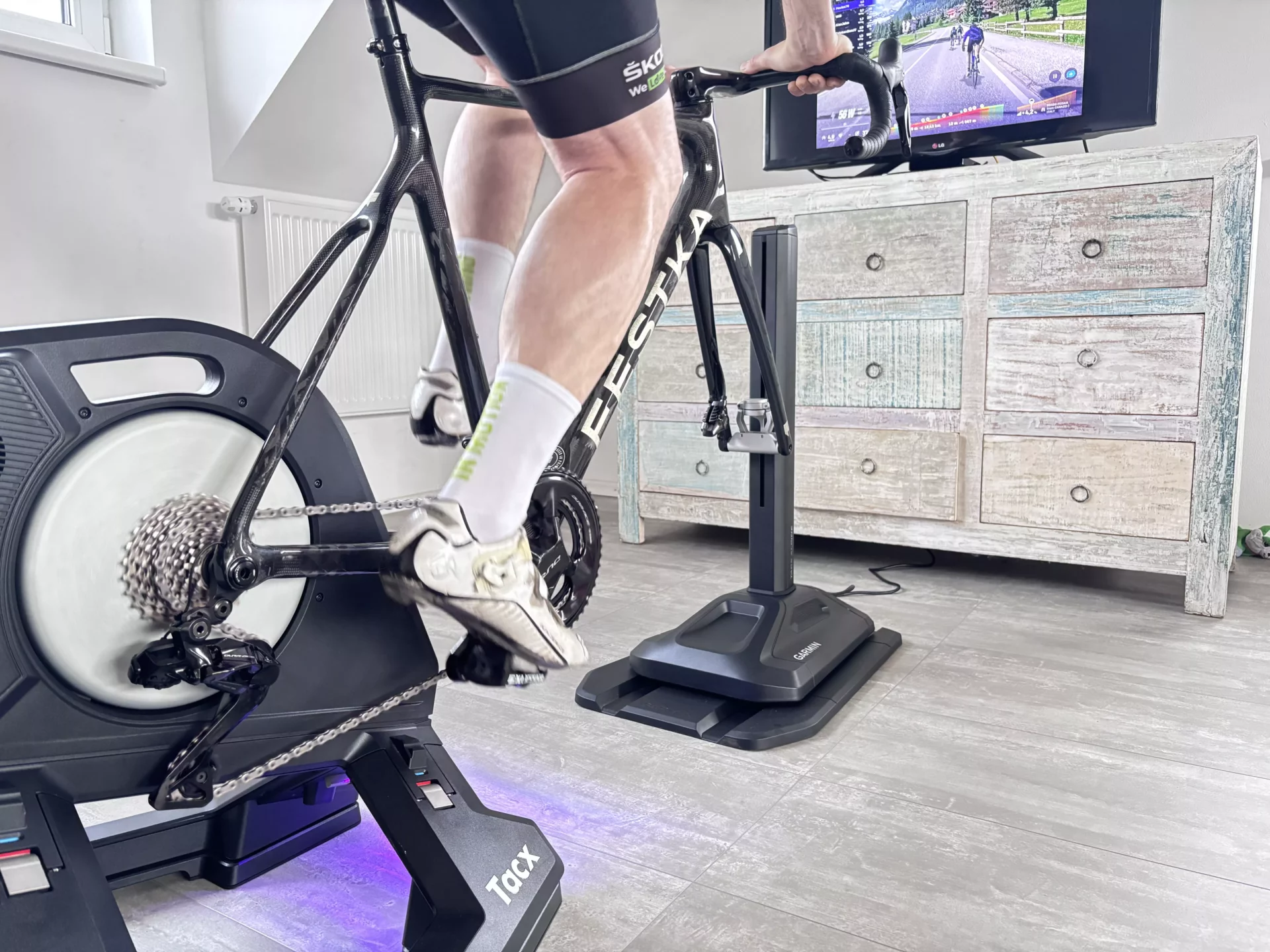 Jako bonus pak Garmin přidal ještě dynamické uchycení vidlice. Řídítka tak pod rukama pracují podobně jako na silnici a v podporovaných aplikacích – aktuálně především Zwift – máte dokonce možnost kolo reálně řídit. To opět ještě víc přispívá k realističtější jízdě a ideálnější svalové koordinaci.