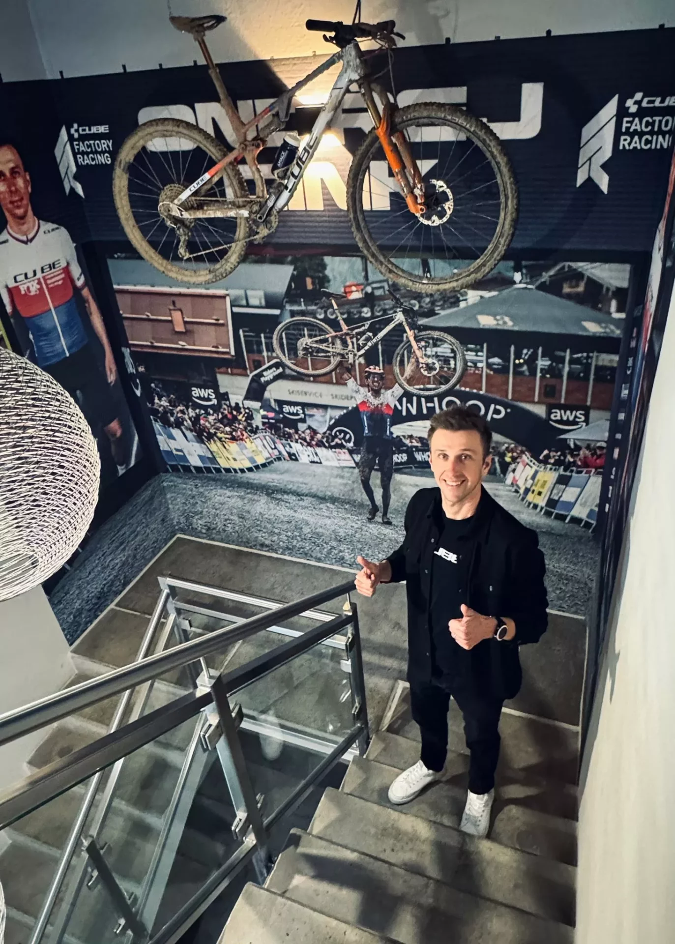 Měl jsem kontrakt na rok s roční opcí. Došlo automaticky k prodloužení smlouvy. Vlastně na základě výsledků, kterých jsem dosáhl ještě před vítězstvím v Leogangu. To už byl jenom bonus. Každopádně šlo o velký moment nejen pro mě, ale i pro značku. V centrále společnosti Cube je na chodbě zelené silniční kolo Bini Girmaye za vítězství v bodovací soutěži na Tour de France 2024. Pak časovkářský speciál Lucy Charles Barlayové, která dvakrát vyhrála na Havaji Ironmana. A teď se výstava rozrostla o třetí exponát v podobě mého vítězného stroje z Leogangu.