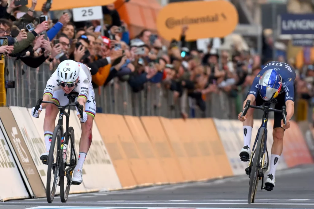 A Strade Bianchén ezúttal a változatosság kedvéért egy 80 kilométeres szólóval verte agyon a mezőnyt (megszerezve a rekordszámú negyedik győzelmét), az pedig, ahogy az eddig hiányzó Sanremót is begyűjtötte patinás gyűjteményébe, megint csak a lehetetlennek tűnő kategória – amiről már számtalanszor bizonyította, hogy számára valóban nem létezik. Pogačar ugyanis 32 kilométerrel a cél előtt egészen komoly bukásba keveredett, nem is nézett ki jól, azonmód szakadt szettben, vérezve kellett az akkor már jó fél percre elszakadó főmezőny nyomába erednie. Ez innen sokak számára valóban lehetetlen vállalkozás lett volna, de nem neki: társai segítségével előbb visszaküzdötte magát az élbolyra, majd mintha mi sem történt volna, tempót váltott és leszakította a fő riválisokat Mathieu van der Poellal együtt, hogy a célvonalnál végül lesprintelje(!) a műfajban kiváló Tom Pidcockot. Egészen elképesztő látni, hogy Pogačar tényleg minden hangszeren játszik, és még ilyen „vis maior” esetek után sincs ellene esélye a riválisoknak.