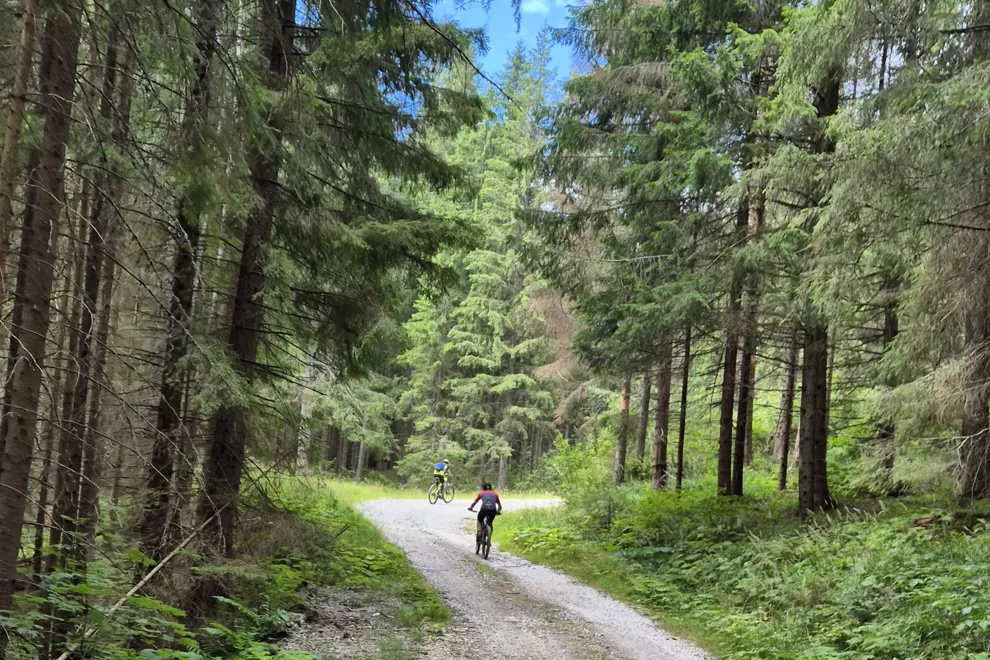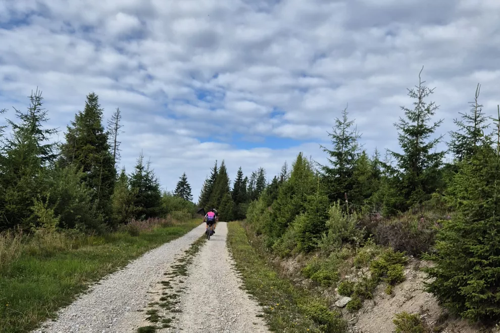 Čaká nás najdlhšie stúpanie: Kráľova hoľa. Lesom po zelenej cyklotrase k rázcestiu Havranie, chvíľku po novom asfalte a šup ho naspäť do lesa na výživný úsek, známy pod názvom Pochodeň.