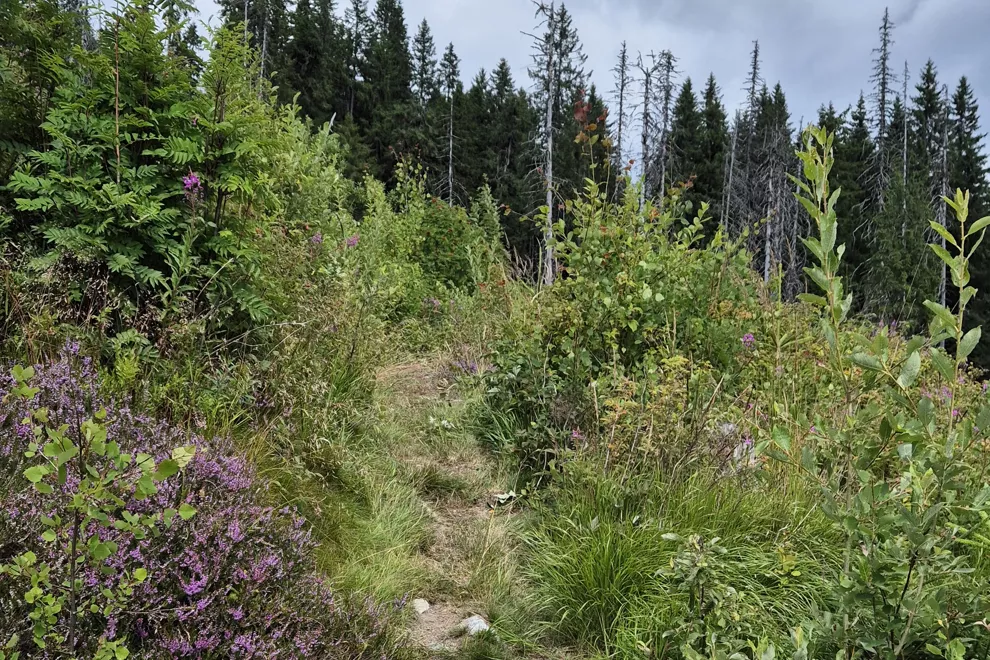 Chvíľu po hrebeni a náročný, poriadne rozbitý zjazd. Som na brzdách. Už neraz som prišiel na to, že som to ráno na parkovisku prehnal s tlakom. Ale baviť sa s tlakmi sa mi tu veru nechce. Tento zjazd sa mi stal minulý rok osudný, teraz našťastie bez defektu zjazdujem do Šuňavy.