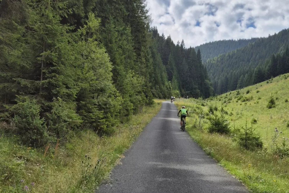 Za chatou kúsok zjazdu po novom koberci a opäť po zelenej cyklotrase, no asi v polovici odbočujeme doľava na ďalšie stúpanie, ale krátke. A zase zjazd. Po ňom nás čaká tentokrát už o dosť náročnejšie stúpanie – Smrečínske sedlo. Na niektorých úsekoch si trochu aj potlačím, stačí malé podšmyknutie kolesa pri zle zvolenej stope a v stojke už nenasadneš. Konečne sme hore.