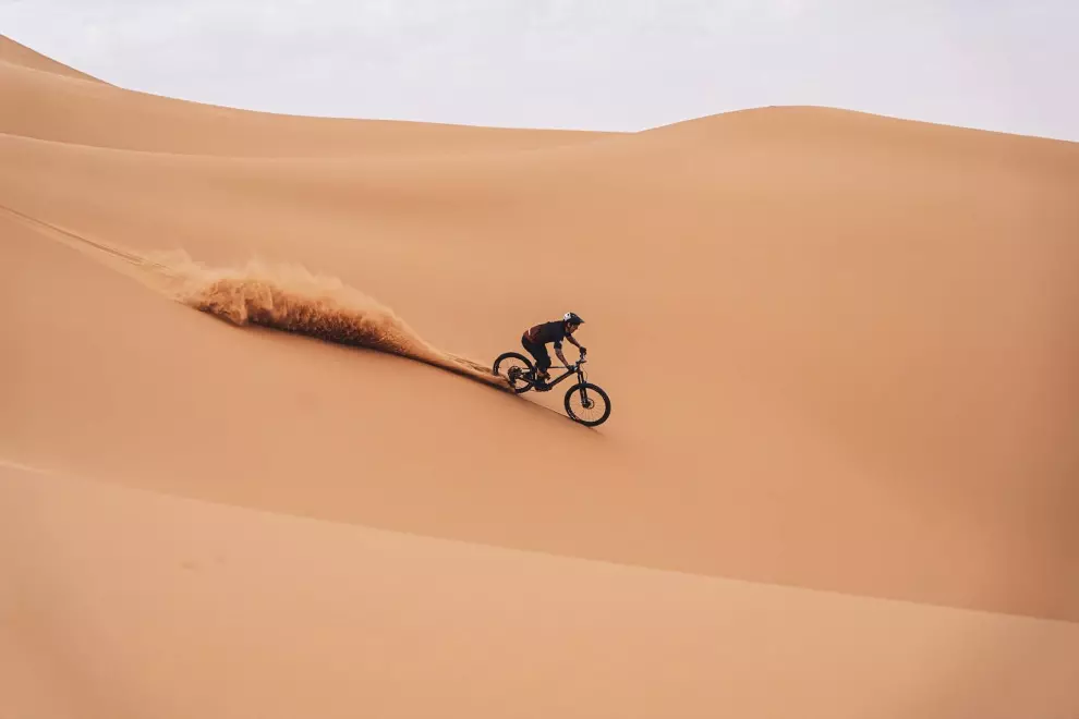 The windward side of the dune, identifiable by gentle waves, is firmer than the leeward side where soft sand can swallow your front wheel and cause you to flip over the handlebars. Always find the harder surface on the windward side. Choosing the right time to ride is also crucial. Early morning conditions are more favourable because the sand is hardened after the cold night and doesn’t sink under your wheels. Additionally, the low sun casts shadows on the ground, helping you read the terrain. At midday, when the sun is high up and the light becomes direct, it’s harder to navigate, and you might miss bumps or holes.