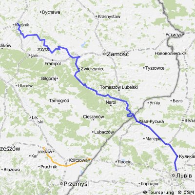 185 km od Kraśnika do Lwowa z czego w granicach Polski znajduje się ok.